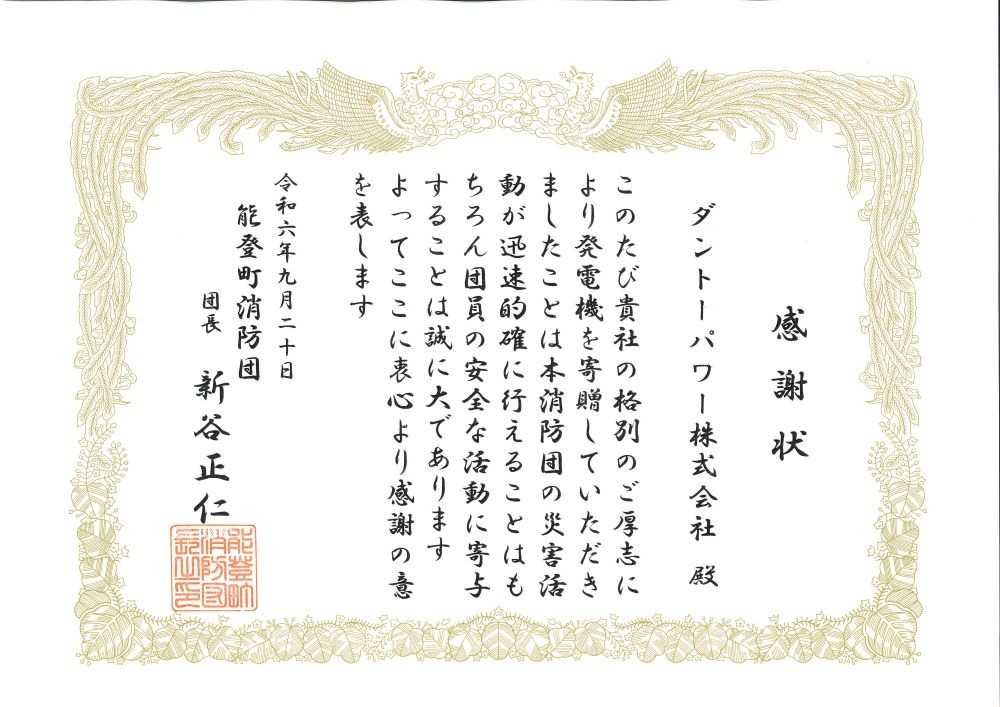 復興支援として非常用LPガス発電機3台を石川県能登町へお届けしました。